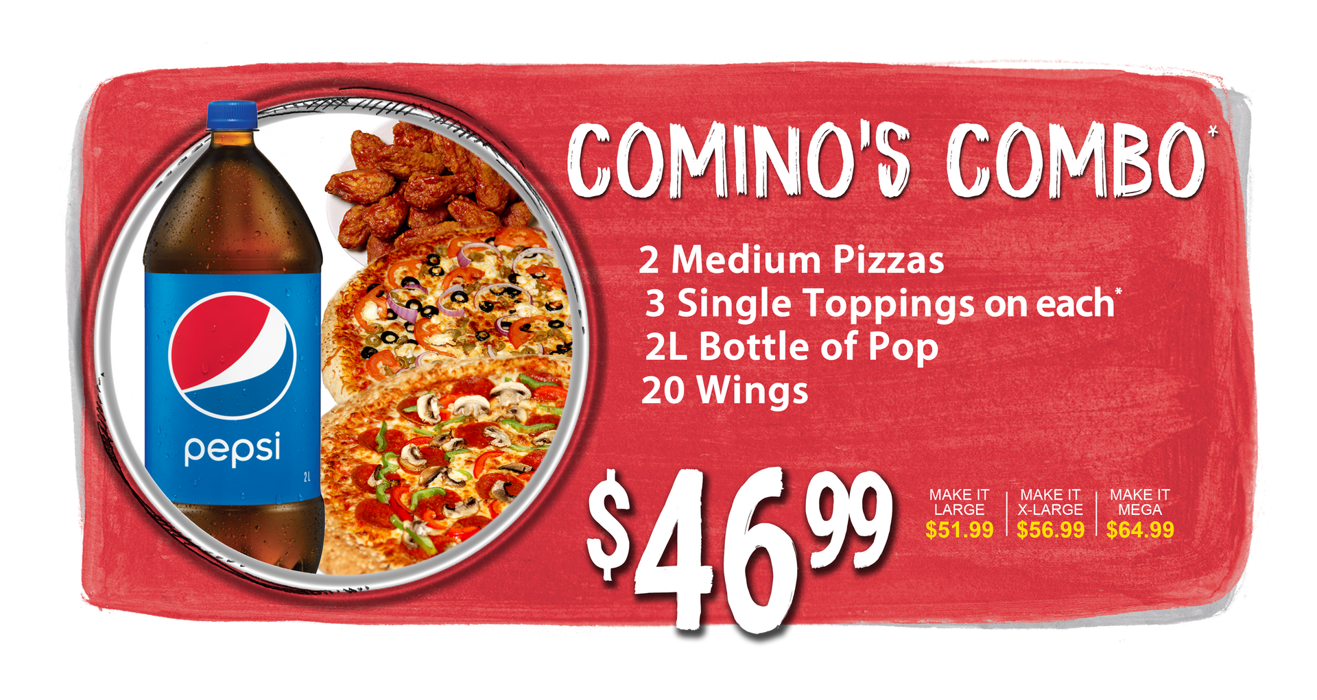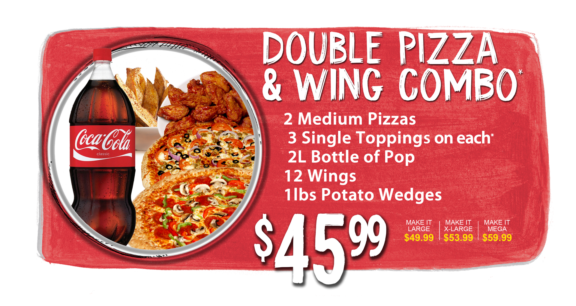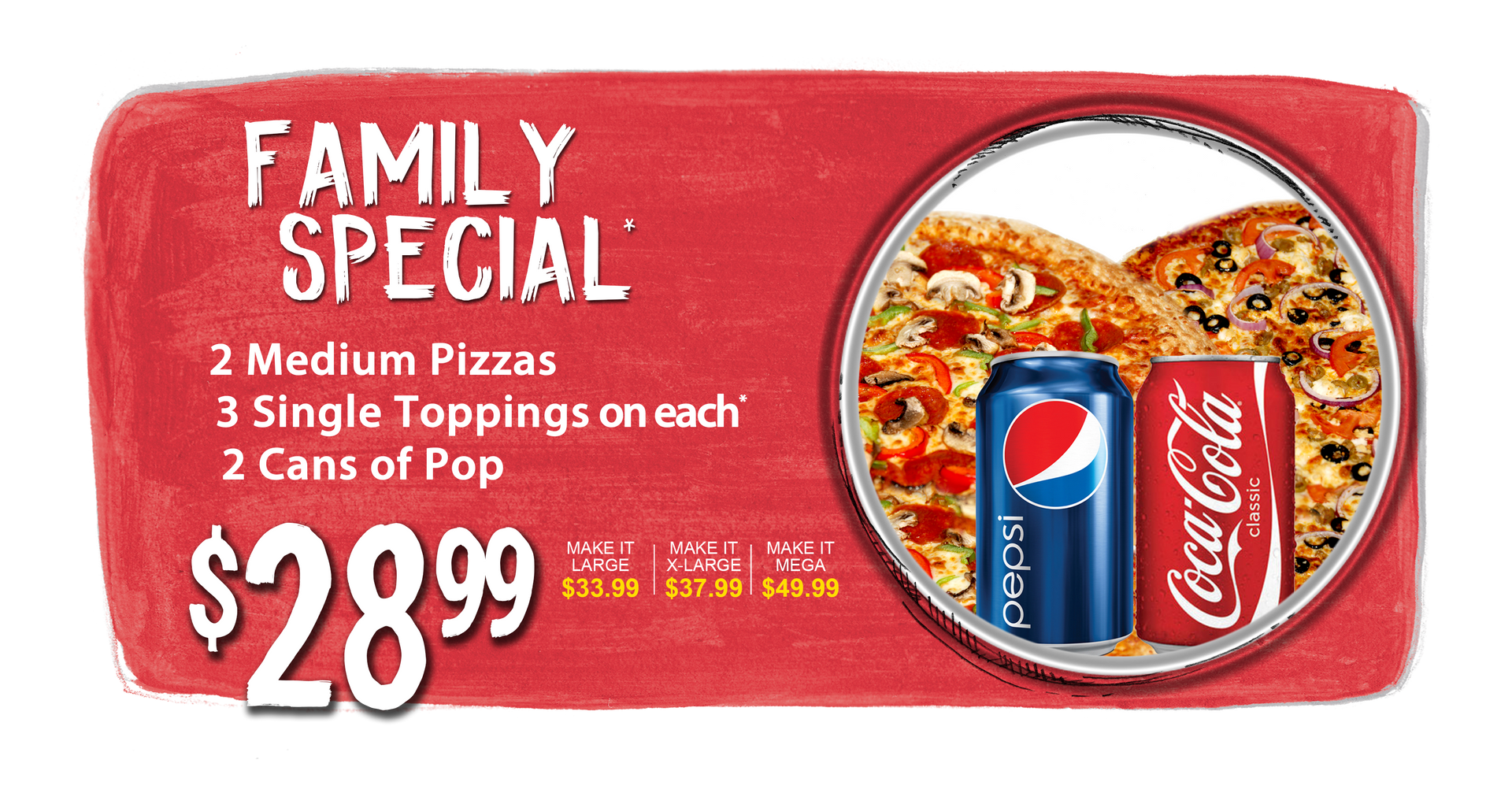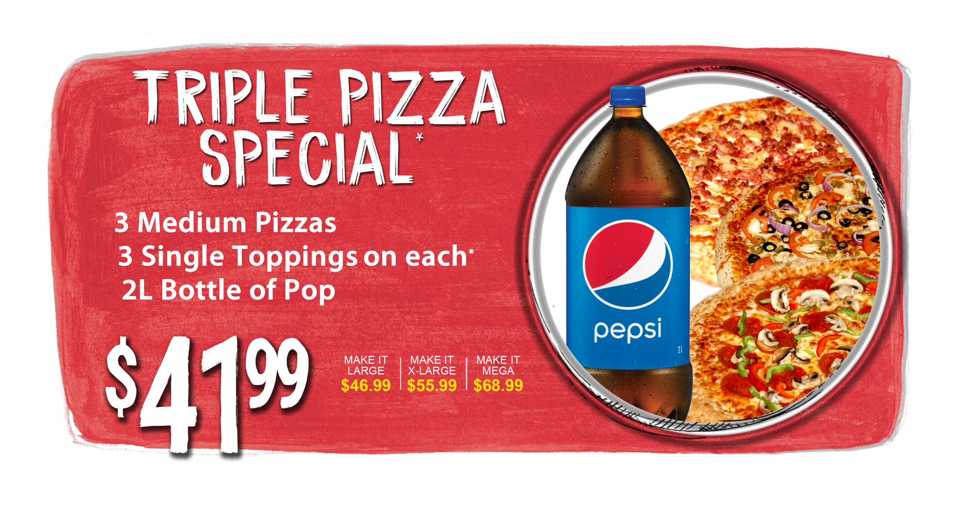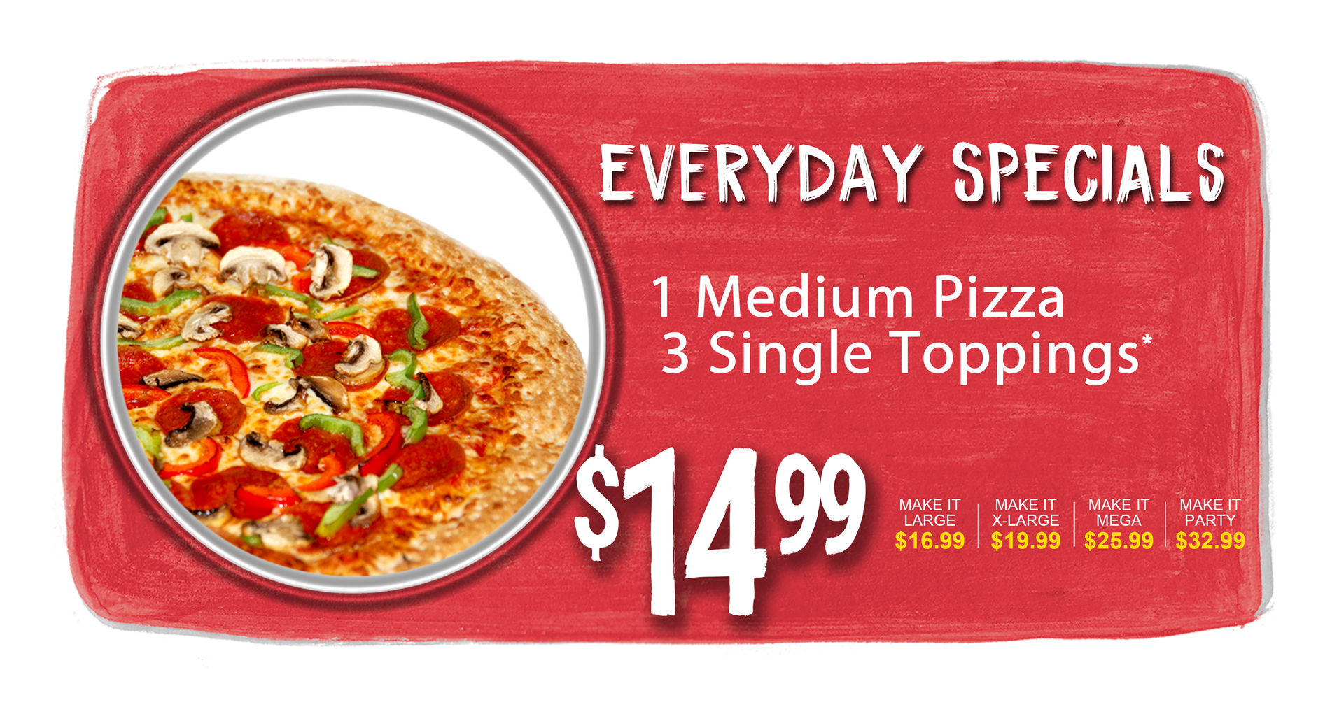 *Taxes and delivery are not included. Minimum of $24.99 (before taxes) required for delivery. All prices exclude taxes and delivery fees. For delivery prices, please call or see in store for details. All prices are based on single toppings only. All specials are limited-time offers. All prices are subject to change without notice. Specials may not be combined. * See in-store or online for single and double topping details. Some exceptions/conditions may apply.
